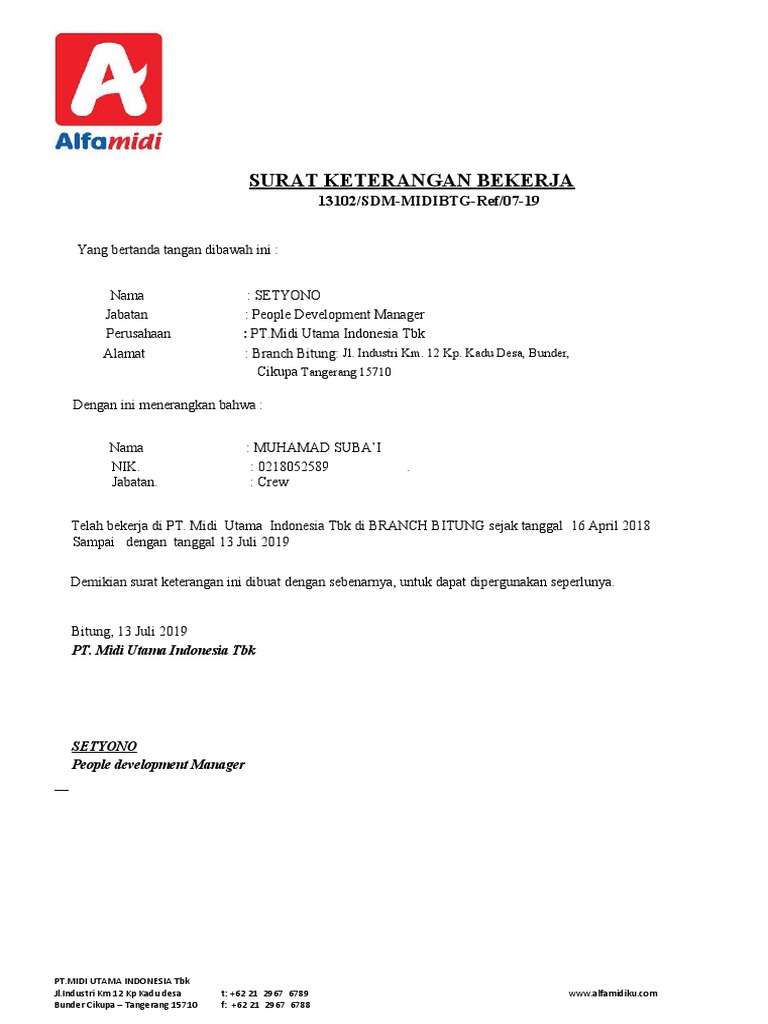 Contoh paklaring pdf surat referensi kerja oleh dosenpendidikan diposting pada 19122020 mencari pekerjaan sekarang memang sangat sulit dan sulit. Pdf contoh surat pengalaman kerja pdf reza harahap academia edu. Lowongan kasir alfamidi terbaru sidoarjo surabaya terbaru januari 2019 contoh surat lamaran kerja cpns kemenkumham untuk s1 dan d3 papua. Contoh surat paklaring alfamidi contoh surat paklaring dari perusahaan multinasional. 15 contoh surat paklaring sebagai penguat pengalaman kerja setelah sebelumnya admin membahas dan memberikan banyak contoh dari jenis jenis surat lainnya maka sekarang admin akan membahas dan memberikan contoh contoh dari surat paklaring.