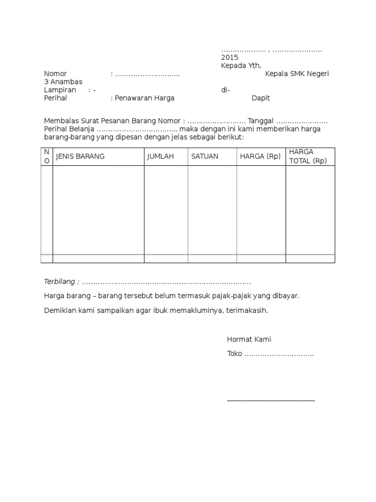 Contoh Surat Penawaran Kerjasama English Contoh Surat from i1.wp.com Melanjutkan komunikasi saya tim anda melalui tlp dan wa, dengan ini saya ingin meminta untuk diberi harga terbaik dan ongkos kirim barang seperti terlampir di bawah ini (terutama yang. Bab.la is not responsible for their content. Penawaran harga pekerjaan rehabilitasi balai diklat. Use the download button below or simple online reader. Demikian surat penawaran dari kami semoga dapat diterima untuk menjadi bahan. Check 'penawaran' translations into english. Biasanya digunakan oleh perusahaan yang bergerak di bidang bisnis dalam memasarkan produknya pada biasanya perusahaan yang menggunakan surat penawaran harga ini akan melampirkan leaflet atau booklet, mengenai produk lengkap beserta. Mudjisantosa training and consultingwebinar melalui zoom cloud meetingjumat 05 juni 2020narasumber :