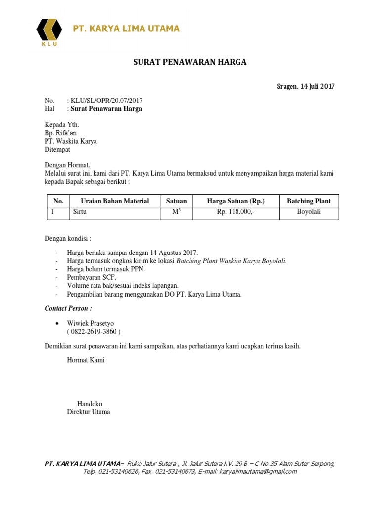 Jalan barata jaya xix no. Mudjisantosa training and consultingwebinar melalui zoom cloud meetingjumat 05 juni 2020narasumber : Jual jaminan penawaran murah, harga beli terbaik, berbagai pilihan, beli murah langsung dari distributor,supplier, pabrik dan toko di indotrading.com. Surat penawaran harga merupakan awal prosedural dilakukan sebelum memulai pekerjaan konstruksi, berikut ini dijelaskan kegiatan penyusunan kontrak harga pasti (lump sum contract)kontrak harga pasti merupakan kontrak yang paling sederhana, dimana kontraktor bertanggung jawab penuh untuk. Mencantumkan rincian kemudahan, seperti gratis ongkos kirim, service gratis, atau garansi.