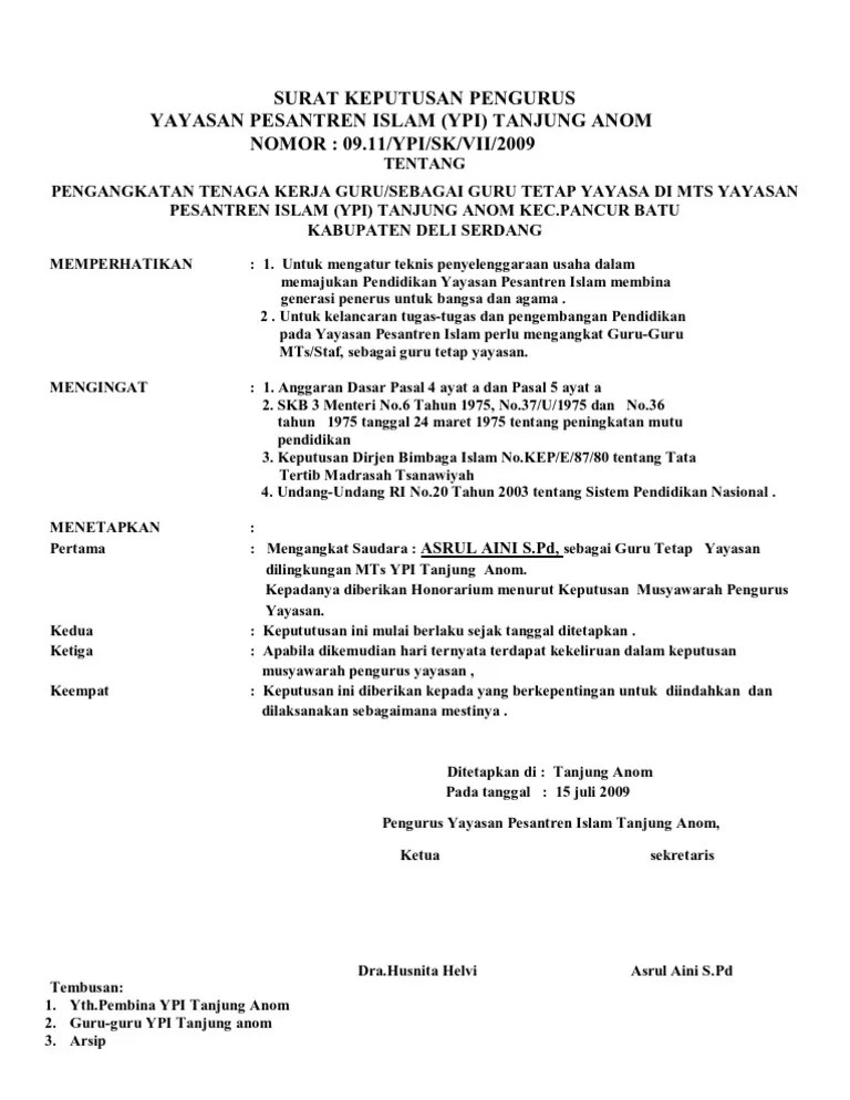 Berikut adalah detail contoh sk pengurus yayasan pondok pesantren.